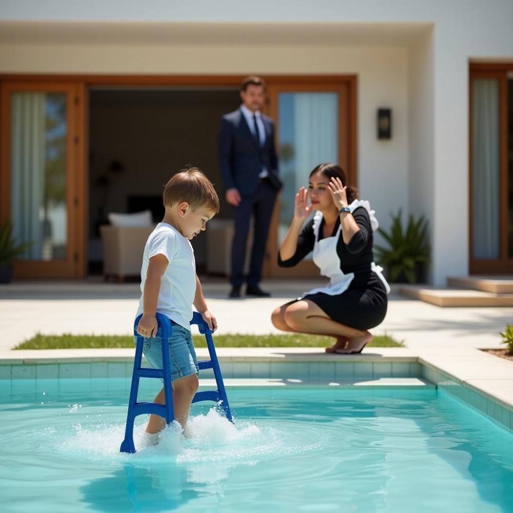 Ahogy kilépett a teraszajtón, a levegőben enyhe klórszag keveredett a nyári alkony párájával. A kis udvari medence vizén apró hullámok futottak végig – és ott, a sekély részben, a víz derékig érő csillogásában állt a fia.