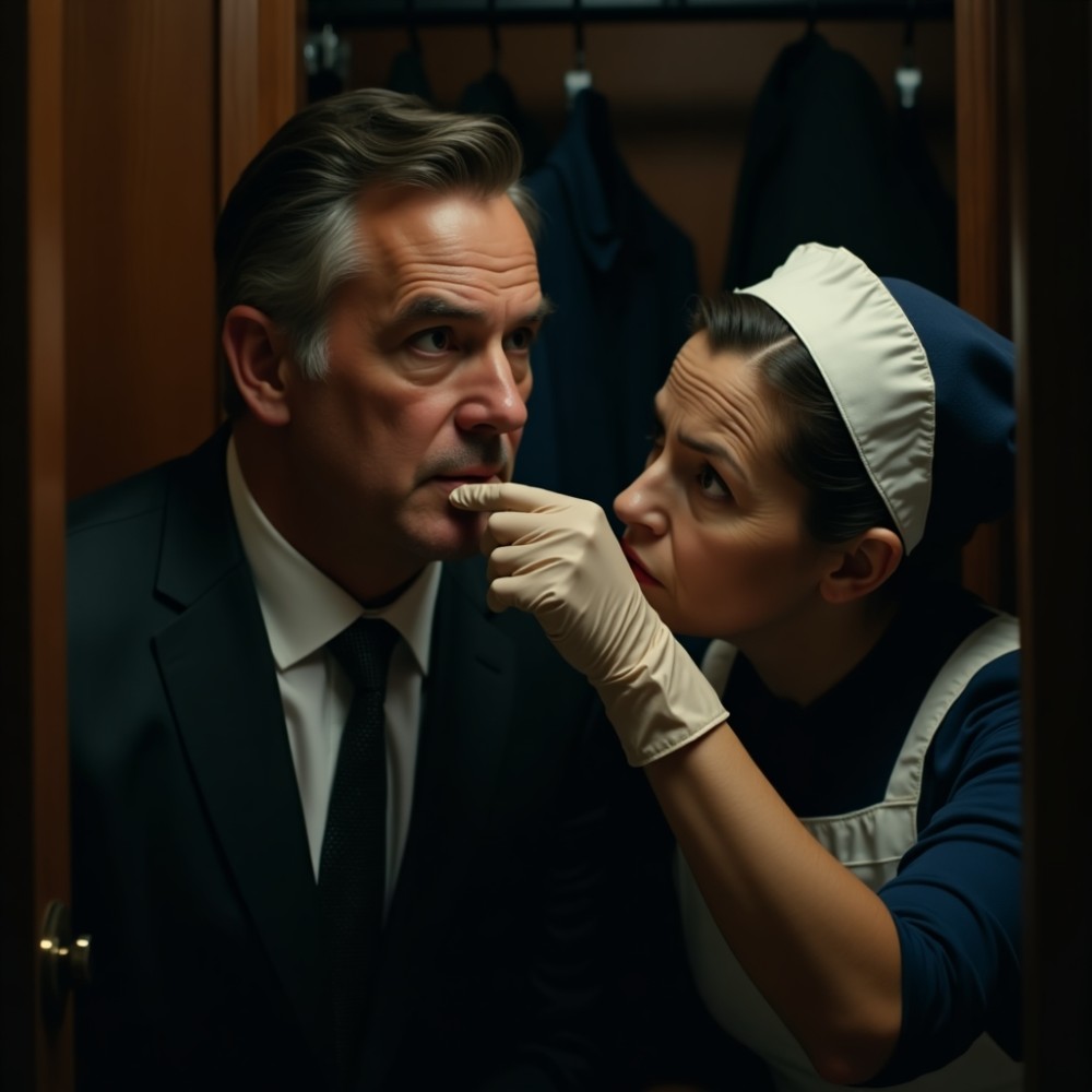 Miklós végül belépett a szekrénybe. Belül bőr és levendula illata keveredett – Klára kabátjai lebegtek finoman körülötte, mintha még ők is tartanák a lélegzetüket. Teréz résnyire csukta az ajtót, és egy utolsó mozdulattal a kezét a szájához emelte jelezve: csendre van szükség.