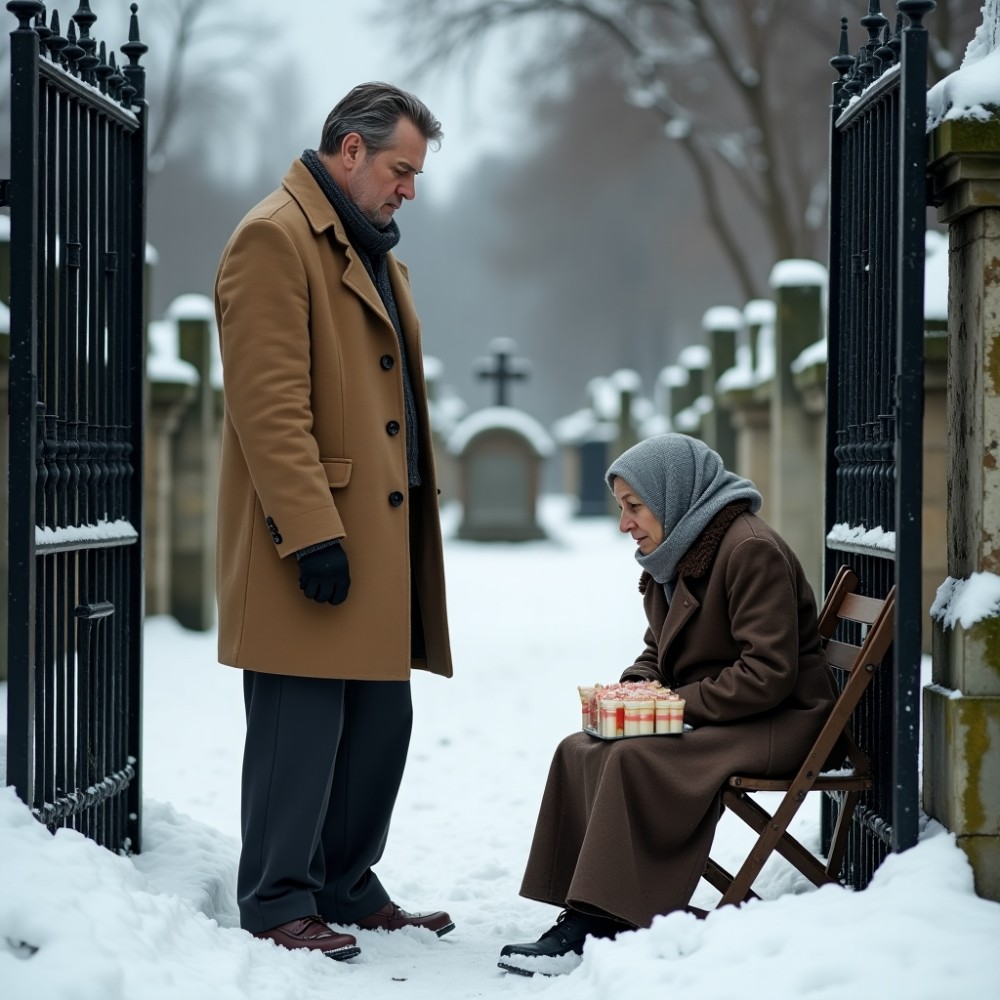 Ahogy kilépett a temető kapuján, valami mégis megállította. A bal oldalon, egy mohos, repedezett kőkereszt tövében, a kovácsoltvas kerítés mentén, egy idős asszony ült egy rozoga kempingszéken. Rongyos barna kabát volt rajta, vastag kendő fedte a fejét, és egy pár csomagolt mécsest tartott az ölében.