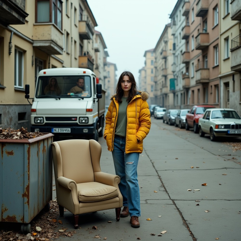 Ekkor egy motor zúgása törte meg az udvar csöndjét. Egy fehér, porral borított kis teherautó gördült be a kapu mellett. Két fiatal férfi ugrott le róla, gyors, gyakorlott mozdulatokkal leraktak egy újabb bútordarabot – egy sarki fotelt –, mintha csak egy rosszul sikerült nap terhét akarnák mielőbb letenni. Szinte oda sem néztek. A következő pillanatban már vissza is szálltak, és a kocsi ugyanazzal a fásult, közönyös zajjal elhajtott.