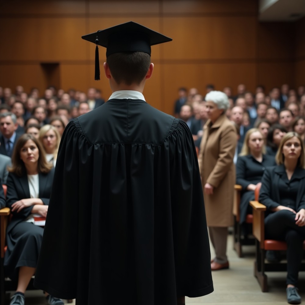 A nevemet akkor szólították, amikor még a gondolataimban próbáltam megfogalmazni egy büszke beszédet – azt, amit a dékán talán sosem kérne tőlem, de amiről álmodoztam. Felálltam, a tekintetem automatikusan végigsiklott a sorokon. És akkor megláttam őt.