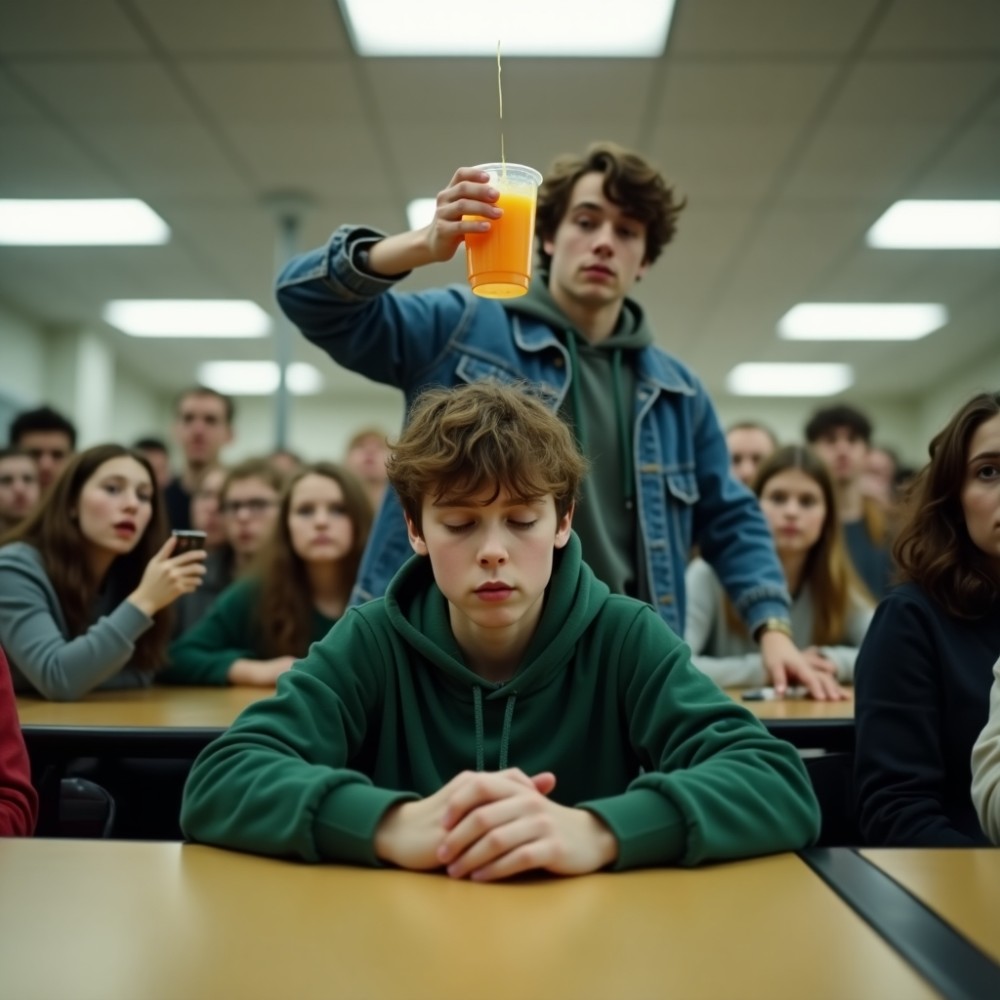 Az ebédlő azon a napon különösen hangos volt. Hétfő, húsleves, paradicsomos húsgombóc – a menzánál még sorban is álltak. A diákok nevetgéltek, valaki a telefonját mutogatta a többieknek, míg mások egymás tálcájáról csentek el pár falatot. Az asztaloknál az osztályok a megszokott rend szerint ültek: baráti körök, „menő srácok”, „jó tanulók”, „örök kirekesztettek”.
