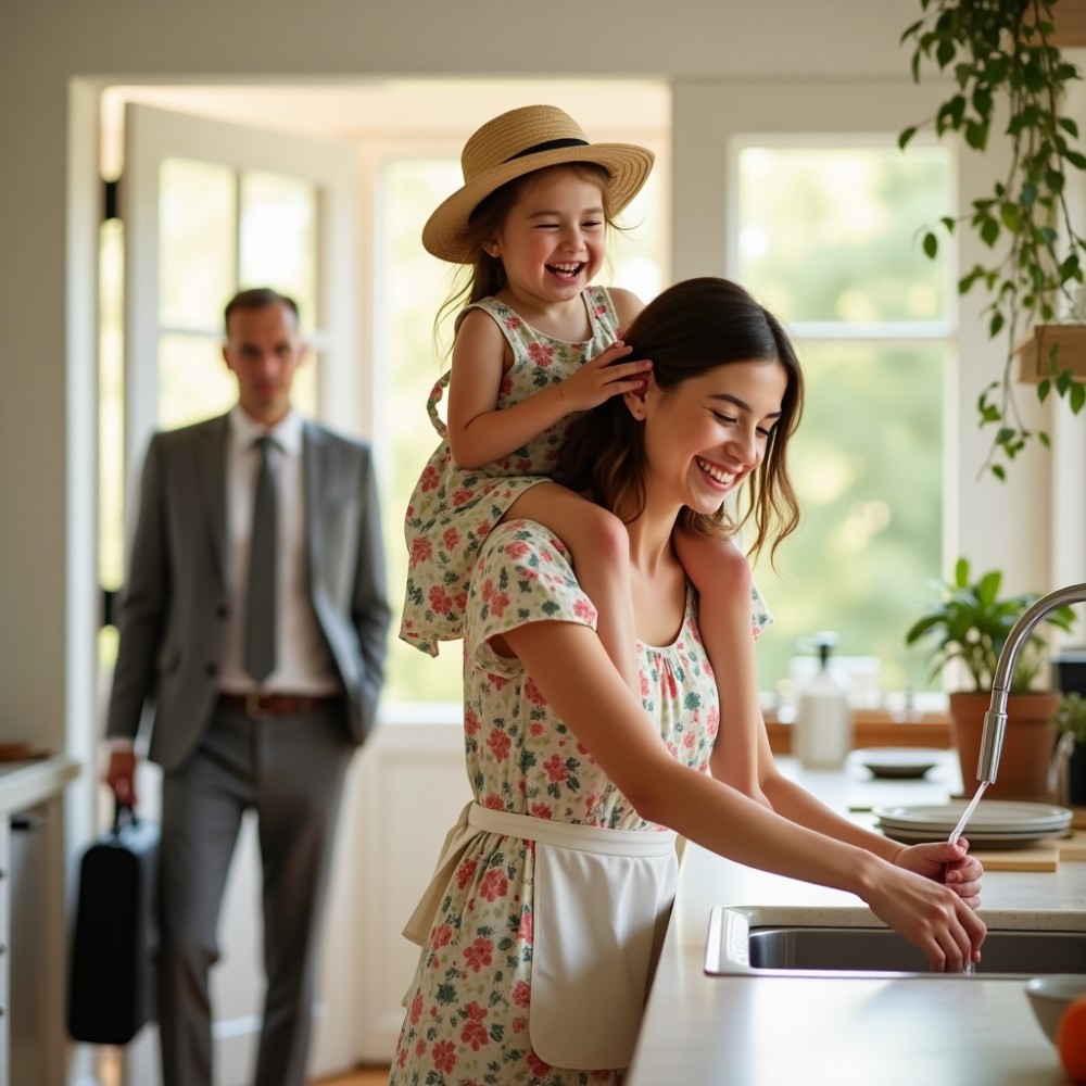 A mosogatónál egy fiatal nő állt, hátán egy gyerekkel.