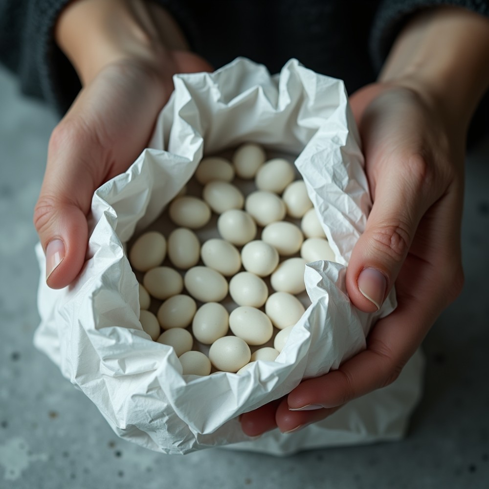 Lassan kisimítottam az ujjaimmal. A papír recsegett, ahogy engedett, és amikor szétnyílt, megláttam a tartalmát. Kis, fehéres darabok feküdtek benne, oválisak, simák, mégis valahogy szabálytalanok. Nem volt rajtuk cukor, nem csillogtak, inkább tompán nyelték el a fényt. Közelebb hajoltam, és megéreztem egy furcsa, nyers szagot, amit nem tudtam hova tenni. Nem volt édes, nem volt gyógyszeres, inkább… idegen.