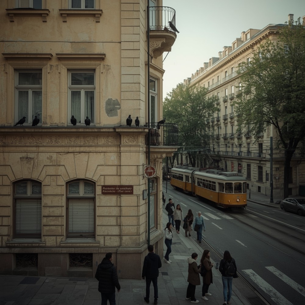 A villamos csilingelve kanyarodott rá a kanyarodra, a pékségből friss kifli szaga szivárgott ki a járdára, a gyerekek hátukon táskával futottak a megálló felé – és közben a szemben lévő öreg bérház harmadik emeleti ablakpárkányán már ott sorakoztak a varjak.