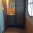 A konyha, hűtővel, mikróval, tűzhellyel, mellette pedig a hálóhelyiségbe vezető lépcső.