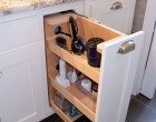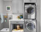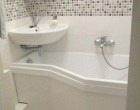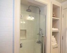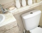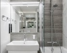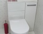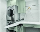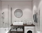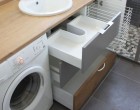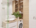 Igencsak érdekes vizesblokkot alakíthatunk ki, melyben lesz minden: WC, fürdőkád (zuhany), mosdókagyló, mosógép, és még macskaalom is. Mindenképpen szükség lesz persze a beépített szekrények használatára, jól átgondolt tárolórendszerek és nem szabványos méretű vízvezetékrendszerek kiépítésére.