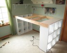 3. A másik polcot is az asztalhoz rögzítette a lécek és a csavarok segítségével, így már egy L alakú asztalt kapott.