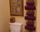 Szerezzünk be egy fémből készült borosüvegtartót és ezen tartsuk a törölközőket.
