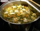 Amikor a zöldség puhulni kezd, hozzáadjuk az apróra vágott burgonyát és az apró húsgombócokat. Együtt teljesen megpároljuk, és tálalásnál tejföllel ízesítjük.