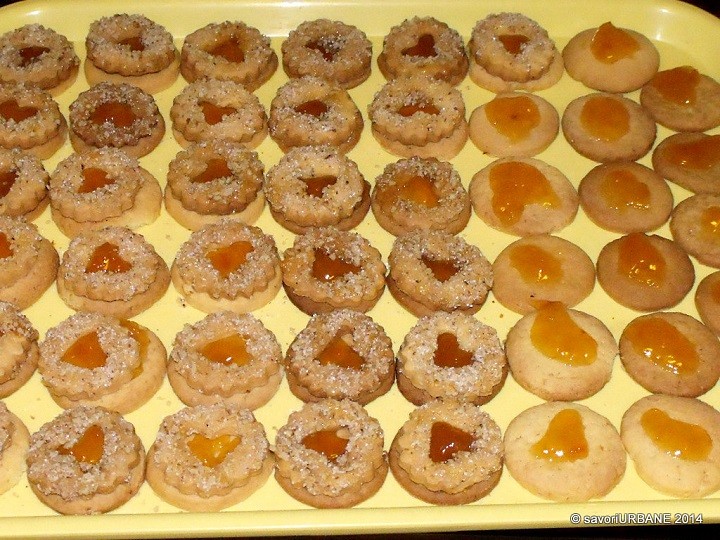 A vaníliát a cukorral porrá dörzsöljük, átszitáljuk. Omlós tésztát készítünk, az összeállított tésztát legalább 1/2 órán át hideg helyen pihentetjük. A tésztát lisztezett deszkán 5 mm vastagságúra nyújtjuk. A sodrófát könnyedén vezessük a tésztán, hogy a tészta a deszkára, sodrófára ne ragadjon. A tészta felét kb. 4 cm átmérőjű, sima, kerek kiszúróval, a másik felét ugyanakkora hullámos szélű kiszúróval kiszaggatjuk. A hullámos szélű korongok közepét kisméretű kerek szaggatóval kiszúrjuk, a felületét tojásfehérjével megkenjük, gorombára vágott, kevés kristálycukorral összekevert dióba mártjuk. A kialakított tésztát egymástól 1,5-2 cm távolságra kenetlen sütőlapra helyezzük, és középforró sütőben halvány rózsaszínűre sütjük. 6-8 perc múlva megnézzük a tésztát, ha néhány darab megsült, késsel kiszedjük, a többit tovább sütjük, pár perc múlva ezt a műveletet megismételjük. A megsült koszorúkat vaníliás cukorral megszórjuk. A korongokra ribizli-, barack-, meggy-, málnalekvárt kenünk, és a koszorúkat úgy helyezzük rá, hogy a lekvár a koszorú közepét kitöltse. Fogyasztás előtt 1-2 nappal készítsük el.