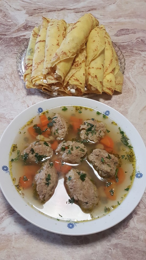 Ebédünk májgaluska leves és palacsinta, túrós, kakaós 😋
