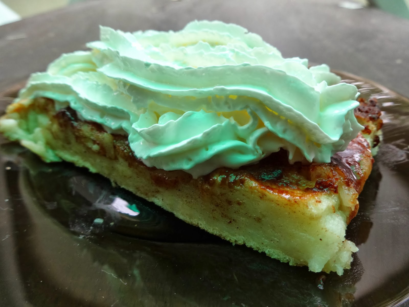 A végén még fél bögre ásványvizet is hozzáöntöttem, majd az összekeverést követően egy kivajazott tepsibe öntöttem. Egy almát meghámoztam, majd szép vékony cikkelyeket vágtam le belőle egymás után, amiket szépen felsorakoztattam a palacsintatészta tetején, jó szorosan, hogy mindenhova jusson. Aztán összekevertem 5 teáskanál cukrot 2 teáskanál fahéjjal és szép gazdagon megszórtam vele a tetejét. Előmelegített sütőben, 180 fokon kb. 25 perc alatt készre sütöttem. Ilyen egyszerű az egész!
