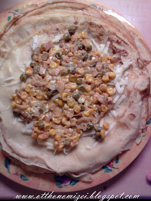 Kikeverjük a palacsintatésztát. Én 2 tojást alaposan felverek, sózom, öntök hozzá kb 3 dl tejet, tovább verem, 1/2 dl szódavíz, csipet szódabikarbóna, pár csepp édesítőszer, és annyi liszt lassan adagolva, hogy ne legyen híg de túl sűrű se legyen a tészta. A végén dolgozok bele 1 ek olajat is .
