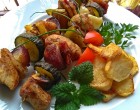 A csirkemellet, bacont és a zöldségeket felváltva a nyársra húzzuk. Az egészet megkenjük a maradék fűszeres olajjal, sütőrácsra vagy grillre tesszük és megsütjük. Tálalhatjuk salátával vagy tetszőleges körettel is.