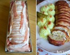 - A baconnal kibélelt formába tegyünk reszelt sajt réteget erre kanalazzuk a csirketölteléket, megint reszelt sajt jön rá, utolsó fázisként pedig a túllógó baconszeleteket szépen ráhajtogatjuk.
