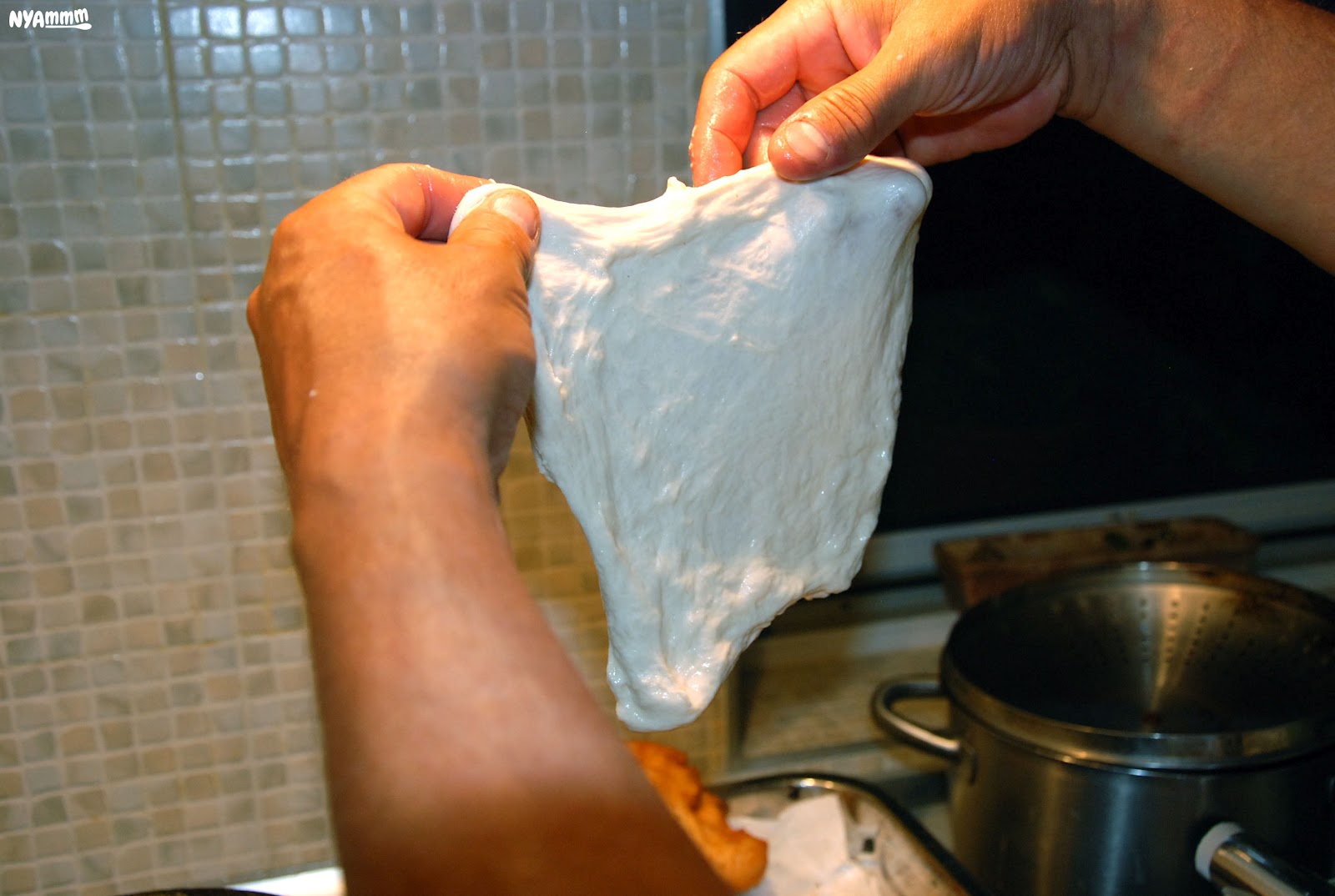 9. A gömbőcöket az olajos ujjbegyeinkkel kell kinyújtani, lehetőleg kör alakúra, úgy hogy ne szakadjon el és a forró olajba helyezni.