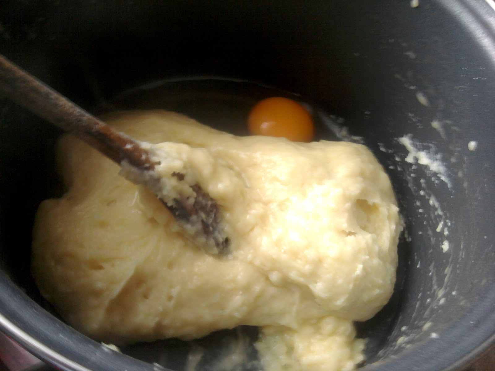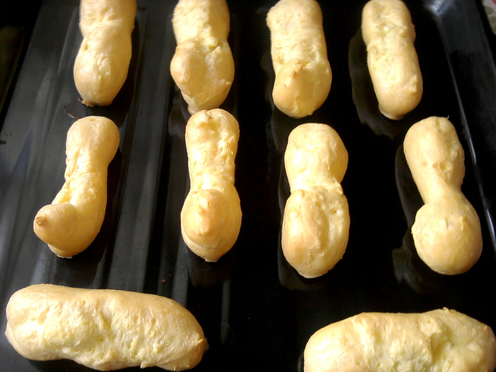 Egy lábosba felteszem a vizet forrni, amikor forr beleteszem a zsiradékot, összeforralom. Egyszerre hozzáöntöm a lisztet, keverem 2-3 percig, amíg elválik az edény falától és szépen összeáll a massza. Ekkor leveszem a tűzről és rögtön belekeverek egy egész tojást. Várok kicsit, hogy hűljön, azután egyenként belekeverem a többi tojást is. A tésztát nylon zsákba rakom, lyukat vágok rá és hosszúkás rudakat nyomok egymás mellé egy nagy tepsiben. Megpróbálom babapiskóta formára, nem mindegyik sikerül. Előmelegített, forró sütőbe teszem, kb. 30 perc alatt megsülnek. A sütő ajtaját nem szabad nyitogatni, mert akkor összesnek a fánkok. Amikor kiveszem a tepsiből, azonnal kettévágom a rudakat, hogy kijöjjön a gőz így nem puhul meg a tészta. A krémhez a tojásokat szétválasztom, a sárgákat egy lábosba teszem, hozzáadom a porcukrot a vaníliás cukrot, jól kikeverem. Ezután jön hozzá a liszt, ekkor egy sűrű massza lesz, jól elkeverem, majd fokozatosan felhígítom a tejjel. Folyamatos keverés mellett sűrűre főzöm. Nem szabad egy pillanatra sem abbahagyni a keverést, mert nagyon könnyen leég. A tűzről levéve hozzáadom a vajat, vagy margarint és lazán beleforgatom a keményre vert tojásfehérje habot és ekkor keverem bele a kakaóport is. Lehűtöm. Amikor már kellően hideg, nylon zsákba szedem, aminek egyik csücskére lyukat vágok. A tejszínt felverem a cukorral, azt is nylon zsákba rakom. A fánkokban ha van hártya, azt kikaparom egy kiskanállal. Először megtöltöm a fánkokat kakaós krémmel, majd erre nyomok tejszínhabot. Ráteszem a tetejüket, amit a cukorból, kakaóporból és vajból, vagy margarinból főzött csokimázzal öntök le. Elég idő és munkaigényes sütemény, de nagyon finom. Nekem ebből a mennyiségből 20 darab, közepes méretű fánk lett.
