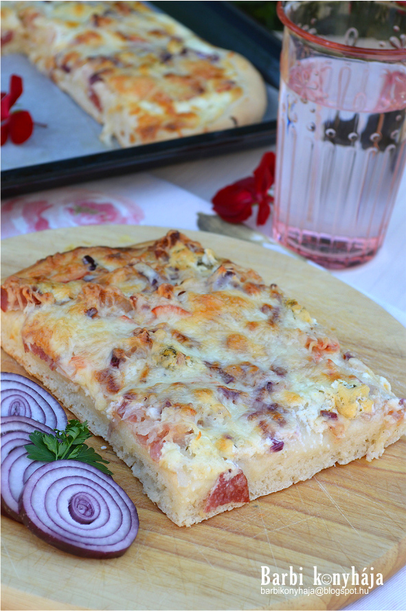 - Tehát a tésztát a tepsibe helyeztük és megkenjük a kicsit megsózott tejföllel, majd rászórjuk a húsokat, a hagymát, végül a sajtot.